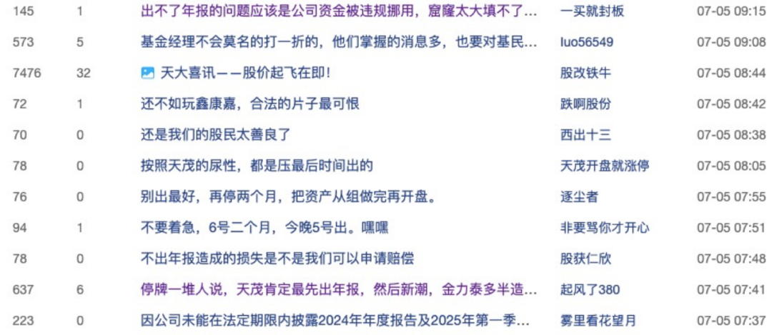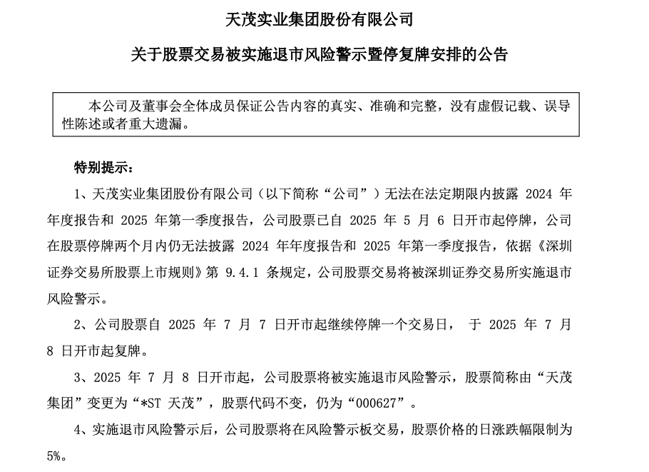 7月6日公告显示,因公司无法在法定期限内披露2024年年度报告和2025年第一季度报,天茂集团股票将披星戴帽。