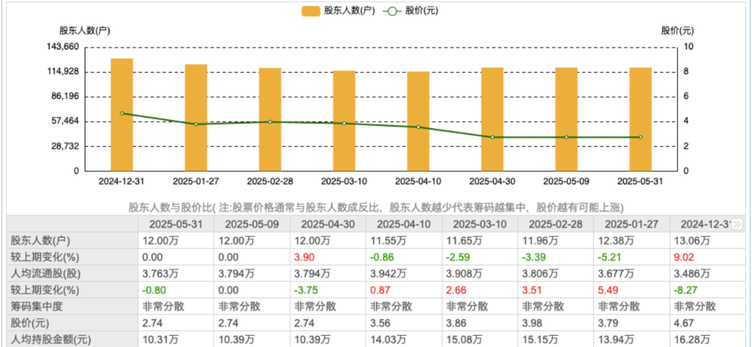 东方财富网数据显示,截至5月31日,天茂集团股东人数约为12万户,人均流通股3.76万股,人均持股金额10.31万元。