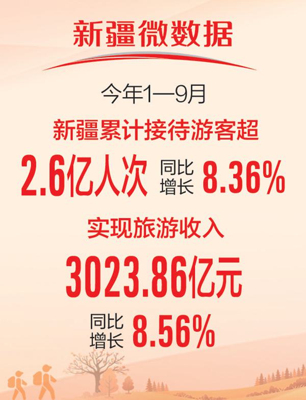 本报乌鲁木齐10月22日讯 石榴云/新疆日报记者张小宓从自治区文化和旅游厅获悉:今年1—9月,新疆累计接待游客26477.44万人次,同比增长8.36%;实现旅游收入3023.86亿元,同比增长8.56%。