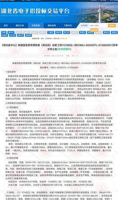 湖北日报讯(记者胡祎)近日,湖北省电子招投标交易平台发布信息显示,宜昌至常德高铁湖北段建设已启动招标。招标单位为武九铁路客运专线湖北有限责任公司。