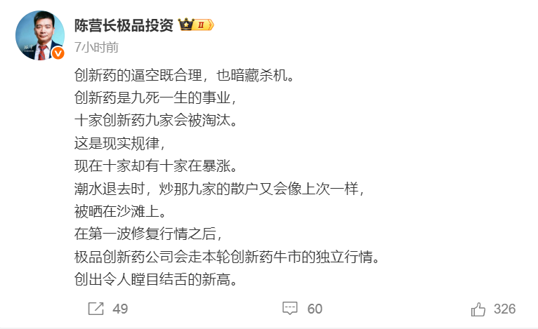 5)知名私募网红陈宇曾是创新药的坚定看好者,如今也在提醒大家注意风险。创新药的逼空既合理,也暗藏杀机。创新药是九死一生的事业,十家创新药九家会被淘汰。这是现实规律,现在十家却有十家在暴涨。潮水退去时,炒那九家的散户又会像上次一样,被晒在沙滩上。在第一波修复行情之后,极品创新药公司会走本轮创新药牛市的独立行情。创出令人瞠目结舌的新高。